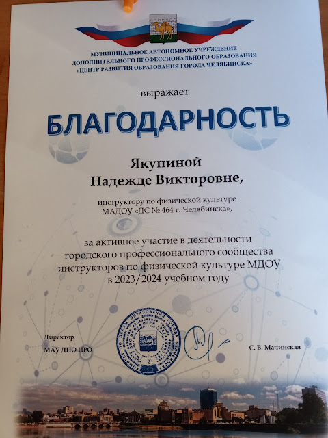 Благодарность за активное участие в деятельности городского профессионального сообщества инструкторов по физической культуре МДОУ